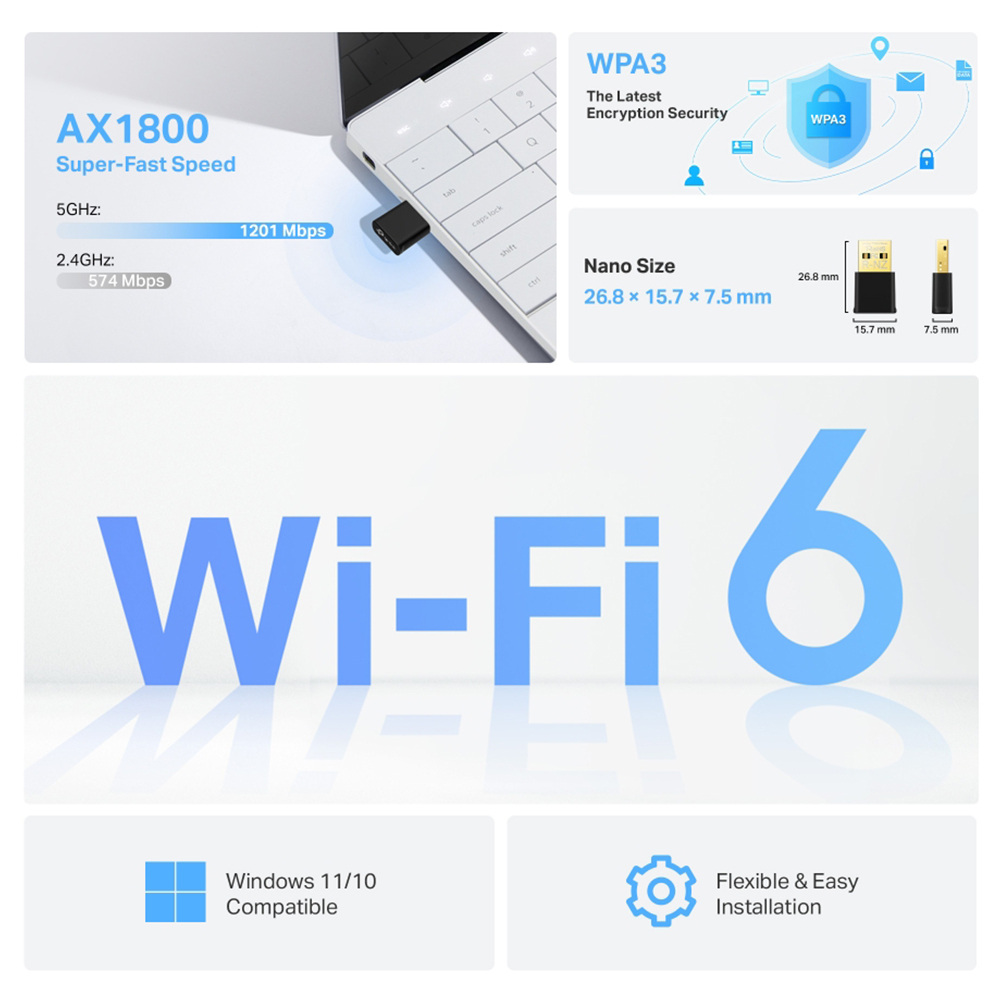 TP-Link Archer TX20U Nano hỗ trợ chuẩn Wifi 6 (AX), mang lại tốc độ mạng đáng kinh ngạc, lên đến 1201 Mbps trên băng tần 5 GHz và 574 Mbps trên băng tần 2.4 GHz. Điều này giúp bạn có thể tải xuống, phát video 4K, chơi game online và làm việc từ xa một cách mượt mà mà không gặp phải tình trạng gián đoạn. Wifi 6 không chỉ cải thiện về mặt tốc độ mà còn tăng cường khả năng kết nối ổn định, đặc biệt trong những môi trường có nhiều thiết bị sử dụng cùng một lúc.