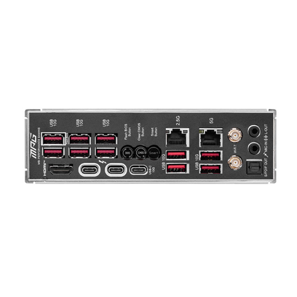 | Cổng giao tiếp ngoài | : USB 10Gbps Type-A Flash BIOS Button Clear CMOS Button Smart Button 2.5G LAN 5G LAN Audio Connectors HDMI™ Thunderbolt 4 USB 10Gbps Type-C USB 10Gbps Type-A Wi-Fi / Bluetooth Optical S/PDIF Out |