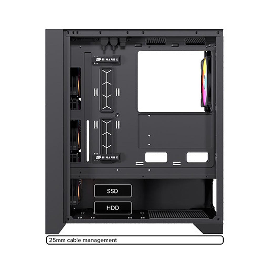 Điểm nổi bật dễ nhận thấy nhất ở vỏ case EINAREX P600 Core Black chính là phần kính cường lực được trang bị ở cả hai mặt bên, không chỉ mang lại góc nhìn trực diện vào hệ thống linh kiện bên trong, mà còn làm nổi bật phong cách build PC cá nhân hóa. Lựa chọn chất liệu SPCC thép, ABS và kính cường lực đảm bảo độ bền lâu dài, đồng thời vẫn đảm bảo trọng lượng tiêu chuẩn ở mức 5.4 kg thuận tiện cho việc lắp đặt và di chuyển.